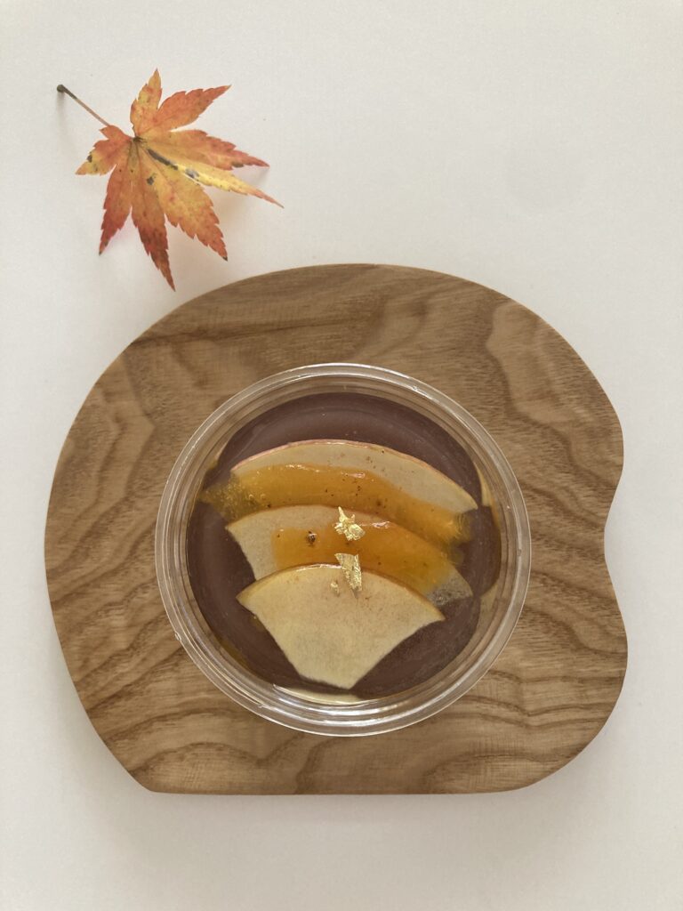 柔らかく仕上げた水羊羹のうえに、シロップ漬けしたりんごと柿。